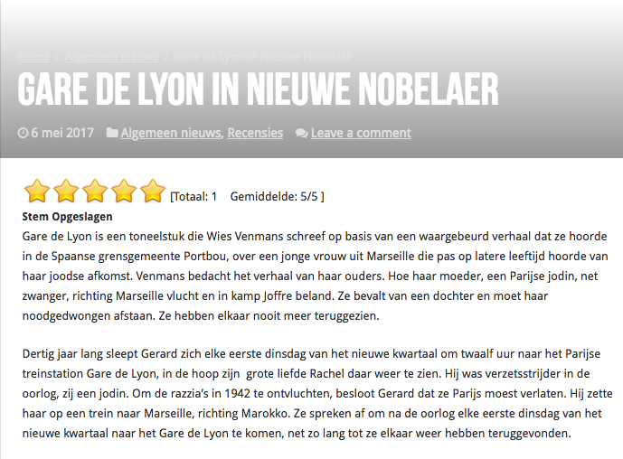 "Gerard : (...) De laatste maanden voor de bevrijding zwierf ik rond, kon niemand meer vertrouwen. Het is een wonder dat ze mij nooit hebben gevonden. Slapen deed ik op de gekste plekken; ik hield me een tijdje schuil op de begraafplaats Père- Lachaise, sliep ’s nachts in een van die mausoleums die rijke nabestaanden voor hun geliefde doden hadden neergezet. Logeren bij een dode, in het begin is dat heel luguber, maar gek genoeg, het went. Uit Script Wies Venmans"