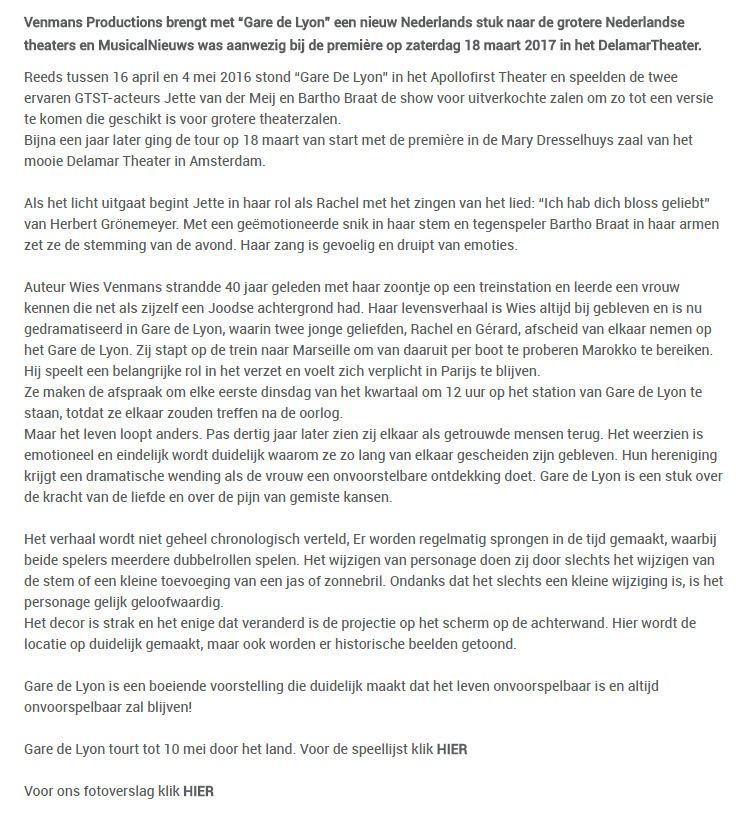 "Gerard : (...) De laatste maanden voor de bevrijding zwierf ik rond, kon niemand meer vertrouwen. Het is een wonder dat ze mij nooit hebben gevonden. Slapen deed ik op de gekste plekken; ik hield me een tijdje schuil op de begraafplaats Père- Lachaise, sliep ’s nachts in een van die mausoleums die rijke nabestaanden voor hun geliefde doden hadden neergezet. Logeren bij een dode, in het begin is dat heel luguber, maar gek genoeg, het went. Uit Script Wies Venmans"